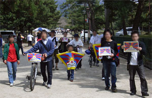 参加者は、チベット国旗や「チベットに自由と平和を!」ステッカーを